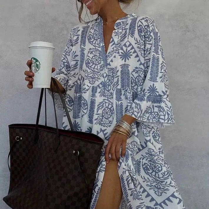This sophisticated, comfortable, and chic dress is designed to make you feel confident and effortlessly stylish all day long. Featuring a timeless V-neck, flattering long sleeves, and a flowy silhouette, it enhances your natural elegance. The durable, breathable fabric ensures comfort, making it perfect for any season. Whether for a casual outing or a formal event, this dress is a must-have wardrobe essential.